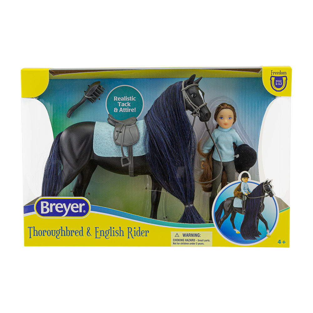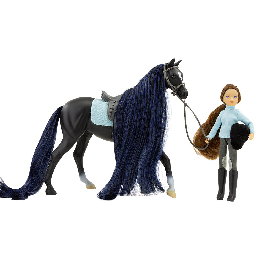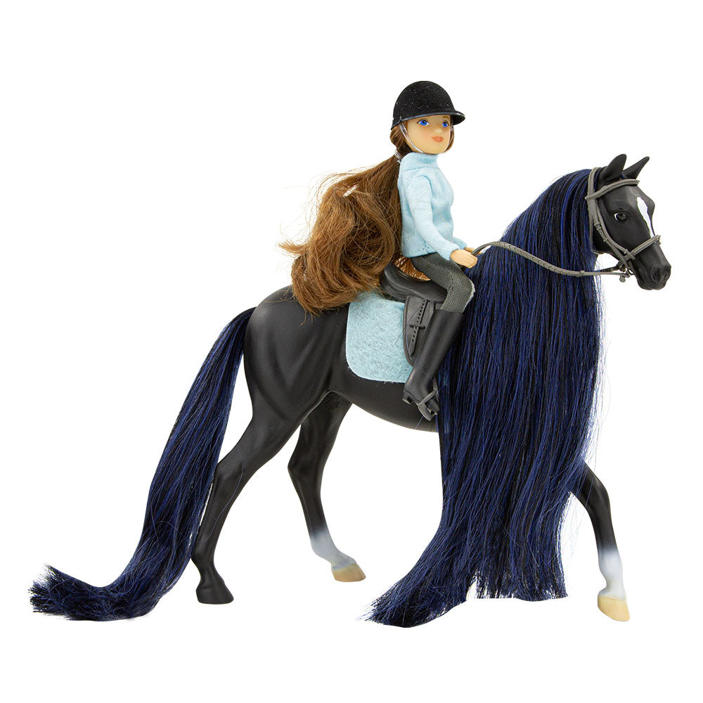 • This fun set includes Jet, a black Thoroughbred horse with silky, brushable black and navy hair, and Charlotte, a 5.75” articulated English rider.